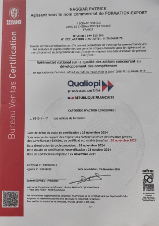L’audit réalisé par le Bureau Veritas Certification a permis de vérifier la mise en œuvre d’une démarche qualité réellement opérationnelle. La marque « Qualiopi » vise à attester de la qualité du processus mis en œuvre par les prestataires d’actions concourant au développement des compétences et permettre ainsi une plus grande lisibilité de l’offre de formation auprès des entreprises et des usagers. La marque « Qualiopi » est délivrée par des organismes certificateurs accrédités ou autorisés par le Comité français d’accréditation (Cofrac) sur la base du référentiel national qualité. Cette reconnaissance est un gage de qualité des formations que nous délivrons et permet à nos stagiaires d’être éligibles aux différents financements.